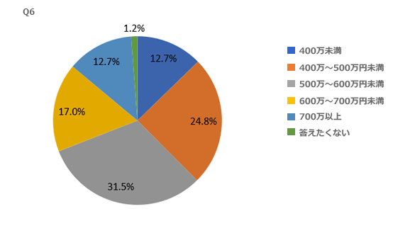 | n | 400万未満 | 400万~500万円未満 | 500万~600万円未満 | 600万~700万円未満 | 700万以上 | 答えたくない | |